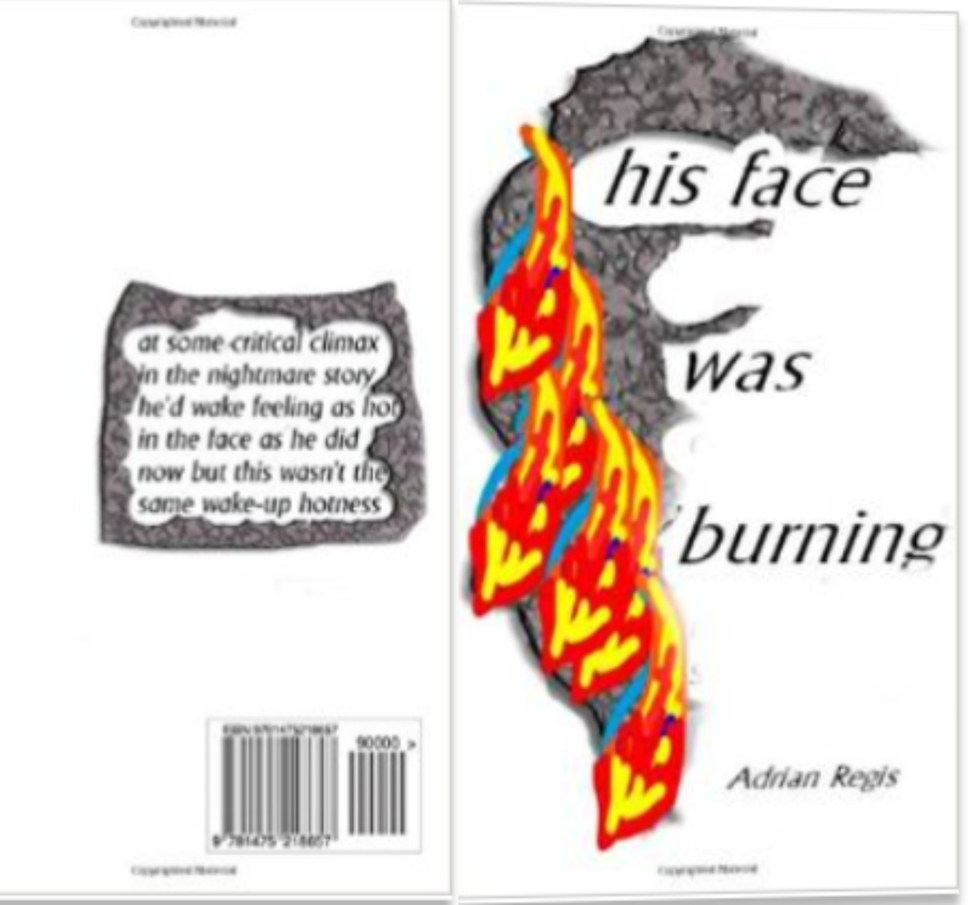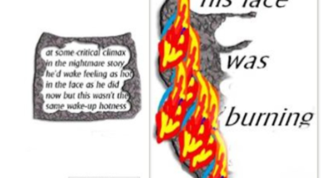 For a long time I’ve been scratching my head over how to improve the book cover of this story of mine. The first one, featuring a red-faced sleeper, never quite did it for me. The next cover, with its ash-grey graphic, continued to be unsatisfactory. With its picture of a face garnished with flame-like decoration and suggestion of smouldering smoke, this week’s cover release is much closer to what I’ve been intending for the book.